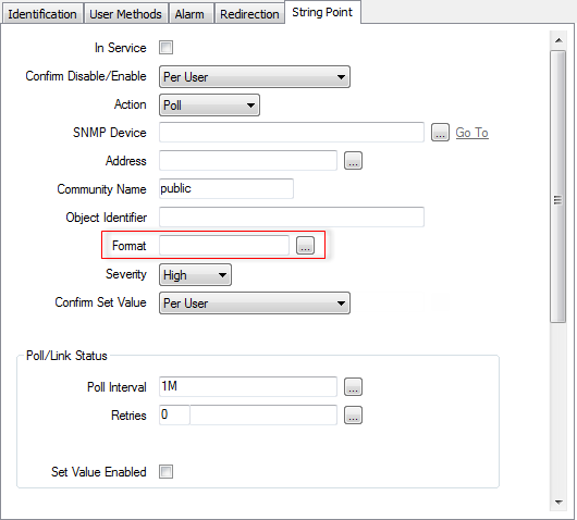 In addition to the common point fields, the SNMP String Point Form displays the Format field at the top of the String Point tab that is specific to the SNMP driver: