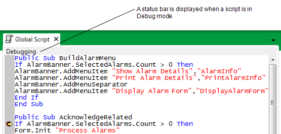 The current state is displayed on a status bar that appears at the top of a script while it is in Debug mode.