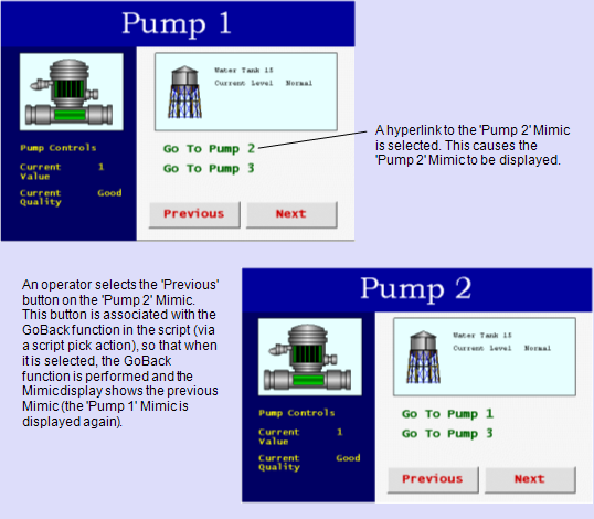 When the button on the 'Pump 2' Mimic is selected, the script is run and the GoBack function is performed. This causes the Mimic display to navigate back to the previous Mimic in the 'chain'—the 'Pump 1' Mimic.