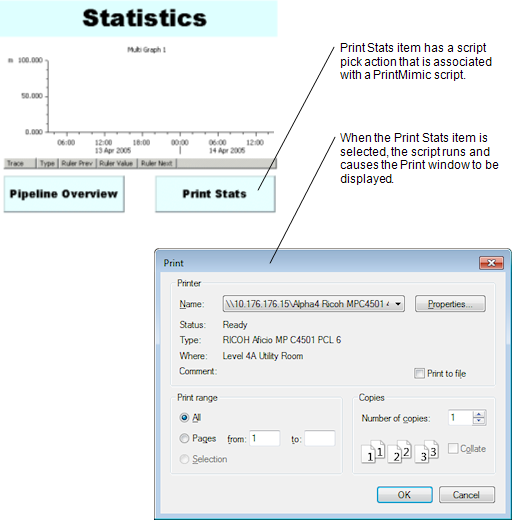 You can use a script to display the print settings for a Mimic. When a user selects the relevant Mimic item, the Windows Print window is displayed. They can use the Print window to define the print settings and initiate a print-out of the Mimic.