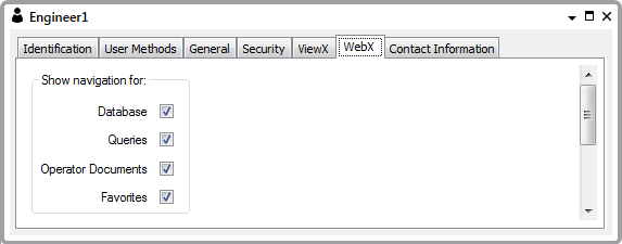 You use the WebX tab on the User Form (or, if applicable, the User Pattern Form) to define a user's navigation access for when they log on to an Original WebX client. Regardless of a user's security settings, an Original WebX client only provides operator-level access to the system. As such, you can only specify the operator-level navigation to which the user has access.