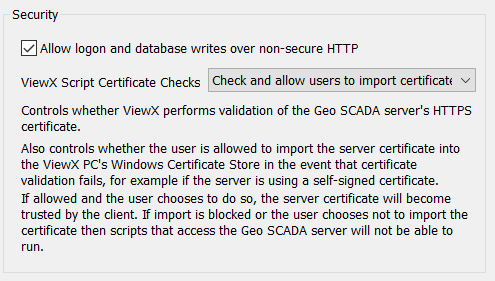 - None—Select this option if you do not want users to run any ViewX script certificate checks. This is the default setting for Geo SCADA Expert 2020.