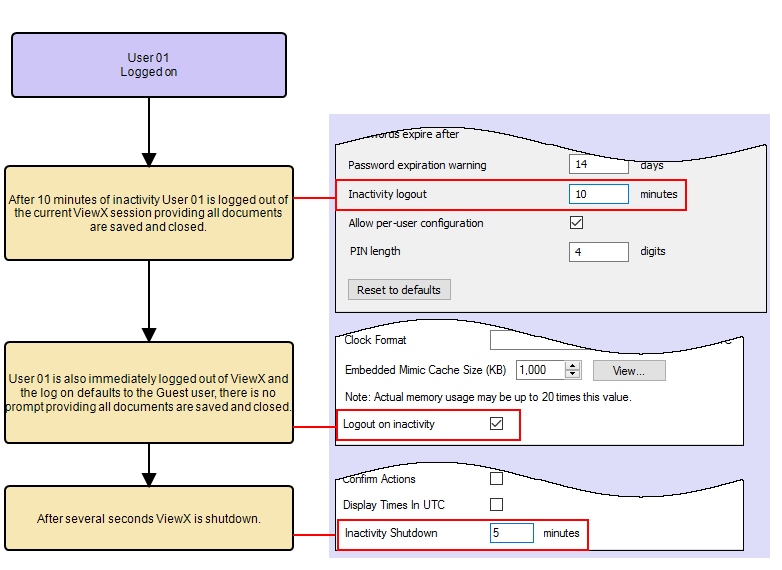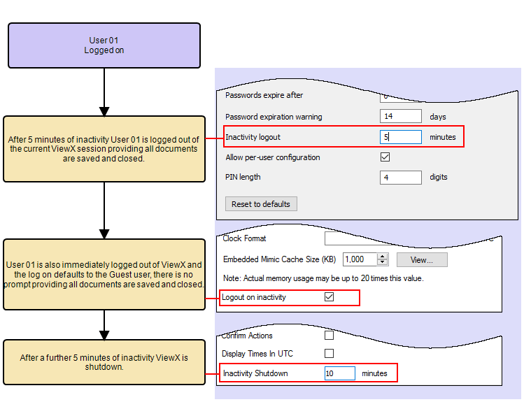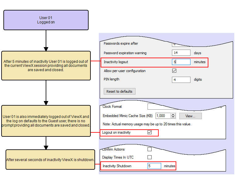 The way in which the Inactivity Shutdown settings affect ViewX depends on the settings of the Inactivity logout and the Logout on inactivity: