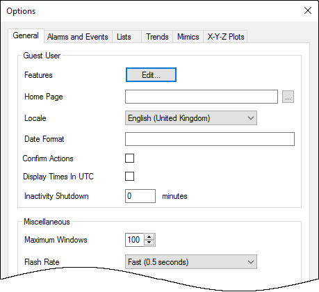 You can use the Options window to define whether the Guest user can access specific features from the client PC. The settings you put in place only apply to the client PC on which they are made and have no effect on the Guest user account when used on any other client or server.