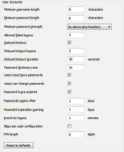 If you clear the Allow Per-User Configuration check box, User Forms will not include a Security tab. The Forms of user accounts that are managed directly in Geo SCADA Expert will inherit the default settings that are specified at the server (so will have the same number of characters per password, same failed log in attempt limits and so on).