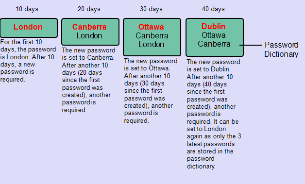 If you set Password Expire After n Days to 10 days and a Password Dictionary Size of 3.