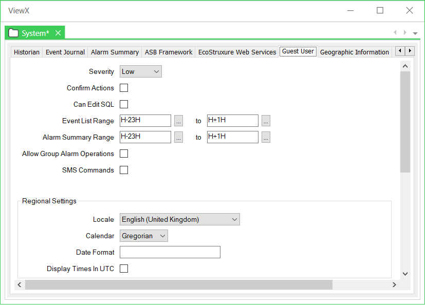 Time Zone Settings: see Time Zone Support in Geo SCADA Expert in the Geo SCADA Expert Guide to Core Configuration.