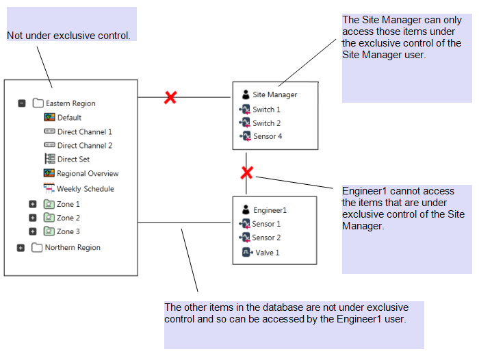 The 'Engineer1' user can access features for the 'Sensor 1', 'Sensor 2', and 'Valve 1' points and any other items that are not under the exclusive control of another user. So, the 'Engineer1' user cannot access the 'Switch 1', 'Switch 2', and 'Sensor 4' points as they are under the exclusive control of the'Site Manager' user.