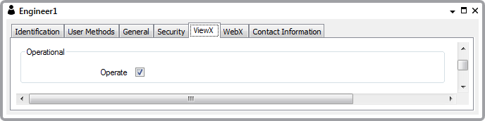 The Operational settings on the ViewX tab allow you to define whether the user can execute methods on items in the database and view system alarms and events.