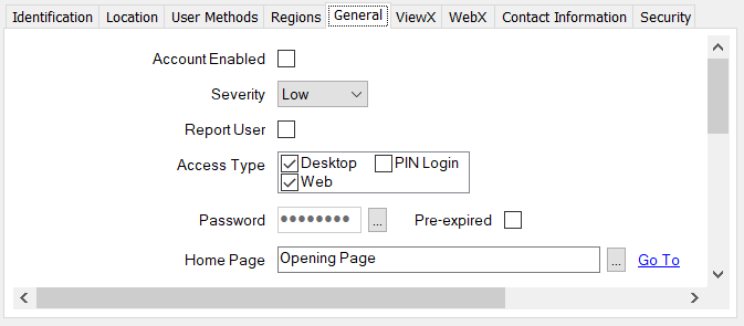 The Regions, General, ViewX, Virtual ViewX, Contact Information, and Security tabs contain settings that are specific to Users and User Patterns. For more information, see the topics that are listed in the gray footer section at the bottom of this topic. Select the relevant entry to display the topic that you require. For information about the Regions tab, see Assign Regions of Responsibility. (You need only configure the properties on this tab if your system uses Geo SCADA Expert's Geographical Location features.)
