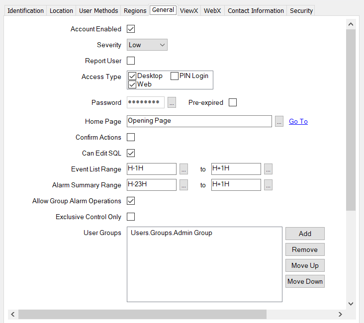 The Regions, General, ViewX, Virtual ViewX, Contact Information and Security tabs contain settings that are specific to Users. For more information, see the topics that are listed in the gray footer section at the bottom of this topic. Select the relevant entry to display the topic that you require. For information about the Regions tab, see Assign Regions of Responsibility. (You need only configure the properties on this tab if your system uses Geo SCADA Expert's Geographical Location features.)