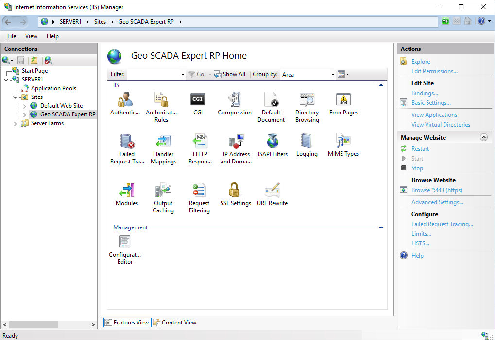 Use the IIS Manager tool in Windows to navigate to the reverse proxy website of the Geo SCADA Expert server.