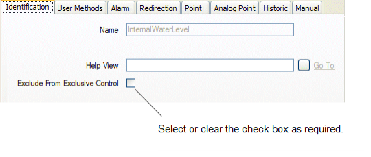To exclude an item from exclusive control, select the Exclude from Exclusive Control check box on the Identification tab of the item's configuration Form. Clear the check box if you want to cancel the exclusion so that the item is included in exclusive control activity again.
