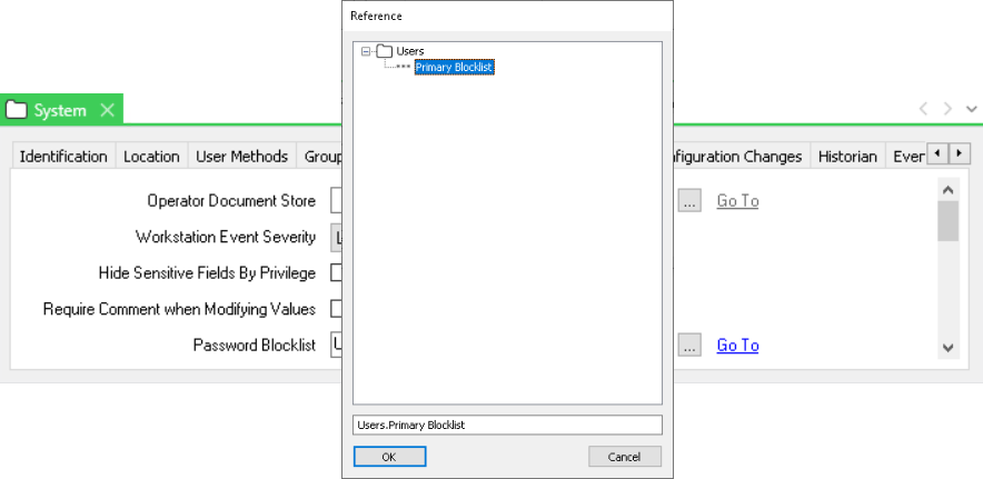 When you have created a Password Blocklist item and imported a password blocklist source file you need to select the item that Geo SCADA Expert uses when passwords are being created.