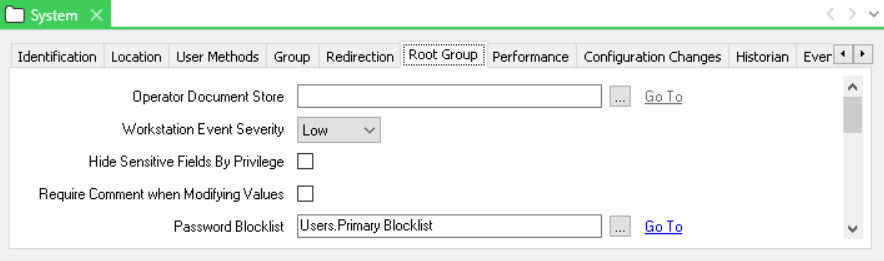 To select the Password Blocklist item you need to access and Configure the Properties of the Root or System Group. The Root Group tab provides you with the option to select the Password Blocklist item that you want to be used within Geo SCADA Expert.