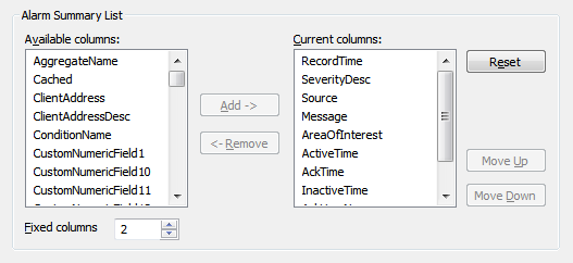 - Use the Fixed Columns spin box to choose the number of columns that remain visible while the rest of the Alarm Summary list scrolls.. For example, if the setting is 2, the first 2 columns will be fixed so that they cannot be scrolled or resized.