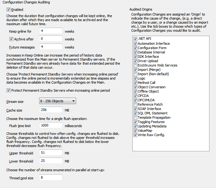 The Configuration Changes Auditing settings consist of two separate groups - the main Configuration Changes Auditing settings and a sub-group of settings called the Audited Origins, (see Configuration Changes Audited Origins).