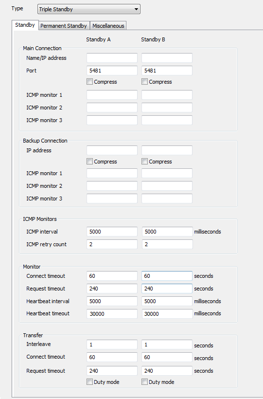 - Use the Standby B column of fields to define the connection settings of the secondary Standby server (see Configure the Main and Backup Connections). In this case, the secondary Standby server is the other Standby server in the architecture (i.e. not the Main and not the Standby server that you are currently configuring).