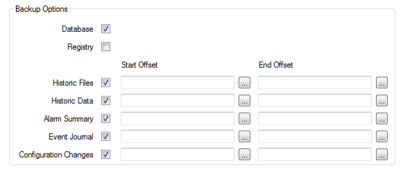 • Use the Start Offset and End Offset fields to specify the time period for which data is to be backed up (these settings do not apply to Database or Registry backups). If you leave both of these fields blank, Geo SCADA Expert will back up all of the data regardless of its age.