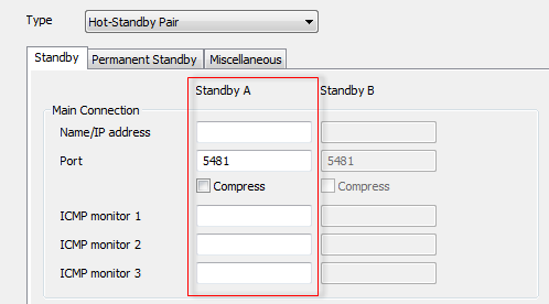 4. Log on to the server that starts as Main and configure it to be part of a Hot-Standby Pair (see Configure the Partners Settings of a Server). You should set the Type to Hot-Standby Pair and use the Standby A column of fields to define the connection settings of the Standby server. For example, in the diagram below, you would set the Name/IP Address, Port, compression settings (Compress), and ICMP Monitors for the Main Connection between the Main server and the Standby server by using the fields in the Standby A column.