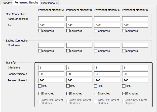 - In the Main Connection section on the Permanent Standby tab, define the primary connection between the Standby server and the Permanent Standby server. To do this, you need to use the Name/IP Address, Port, and Compress settings. There are several columns of these settings and the column you need to use depends on whether the Permanent Standby server is the first, second, third or fourth Permanent Standby server you are adding to the system architecture: