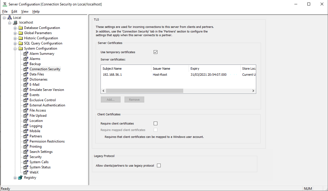 You use the Connection Security section of the Geo SCADA Expert Server Configuration Tool to set up the server's certificate settings for communications with the other servers and clients on your system. The Connection Security section is located within the System Configuration branch of the tool. We strongly recommend that you set up your system to use trusted certificates to initiate secure connections and encrypt the data that is transmitted between the Geo SCADA Expert servers and clients. For more information about the use of certificates and also about the configuration settings that are required for client certificates, see Certificates for Geo SCADA Expert Server and Client Connections.