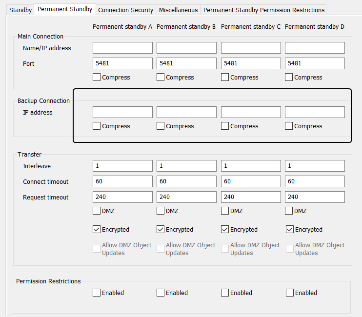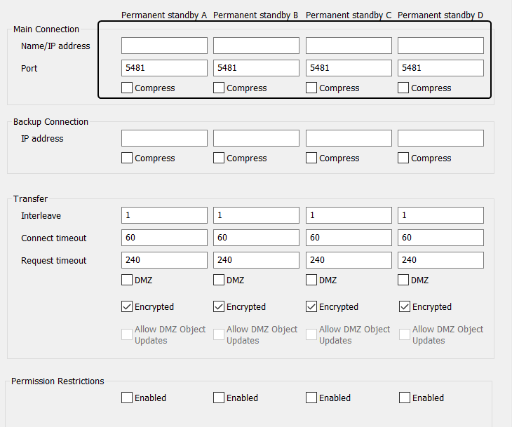 - In the Main Connection section on the Permanent Standby tab, define the primary connection between the Main server and the Permanent Standby server. To do this, you need to use the Name/IP Address, Port, and Compress settings. There are several columns of these settings and the column you need to use depends on whether the Permanent Standby server is the first, second, third or fourth Permanent Standby server you are adding to the system architecture: