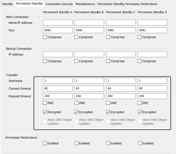 Hot-Standby systemsOn Hot-Standby systems, we recommend you use the Permanent Standby A column of settings for the first Permanent Standby server you add, Permanent Standby B for the second Permanent Standby server, Permanent Standby C for the third, and Permanent Standby D for the fourth (you only need to configure the settings for the number of Permanent Standby servers you have)