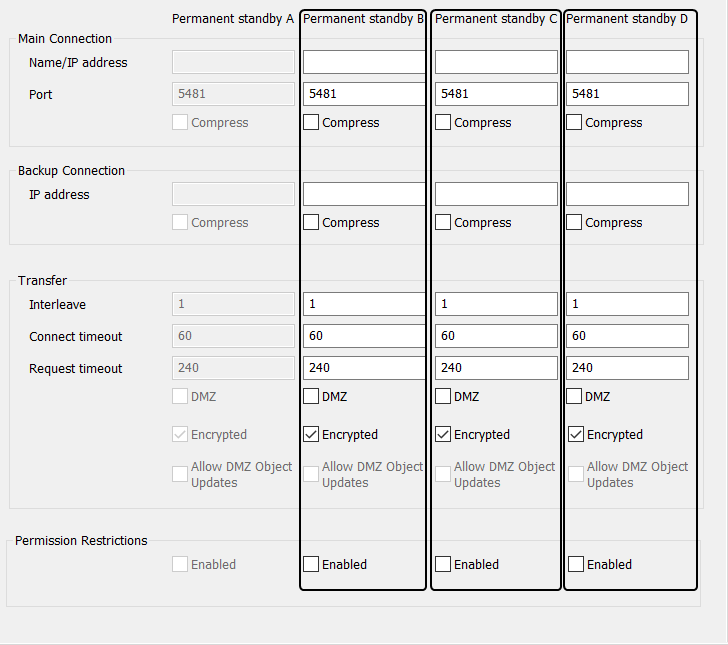 Triple Standby systemsOn Triple Standby systems, we recommend you use the Permanent Standby B column of settings for the first Permanent Standby server you add, Permanent Standby C for the second Permanent Standby server, and Permanent Standby D for the third.