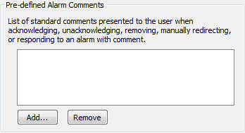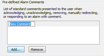 By default, there are no standard alarm acknowledgment comments. That means that any user that uses the Acknowledge with Comment action has to enter a comment using their own words. By using the Standard Alarm Acknowledgment Comments feature, you can configure standard comments that are available to users from a spin-box—users can choose to select one of the standard comments instead of entering their own comments. This is useful when you need your system to have consistent comments that are descriptive and indicitive of the alarm situation.