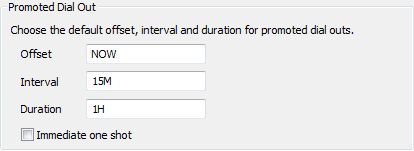 The default promoted dial out settings define the amount of time between each dial out to a promoted outstation and the total amount of time each outstation is promoted. They also determine whether a One Shot data retrieval is performed as soon as an outstation is promoted, or whether the One Shot only occurs after the first interval.