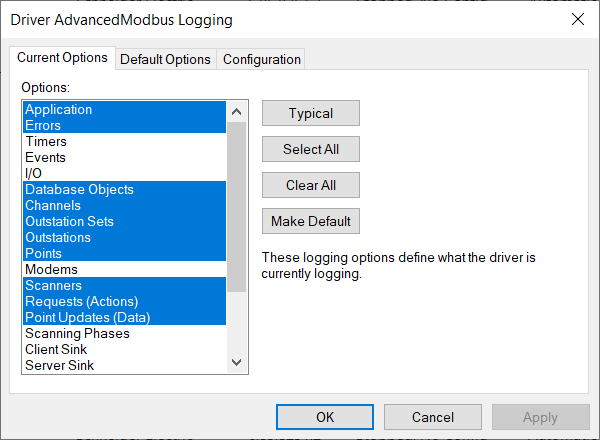 - Use the Current Options tab to temporarily change the logging options for the driver. The driver will revert back to the default logging settings the next time it starts. You can change the logging options by selecting or deselecting them in the Options list or you can use the buttons as follows: