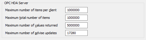 Use the section to set limits for the number of OPC HDA items that you can create. This can help to prevent denial of service due to OPC HDA clients creating an excessive number of items.