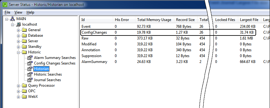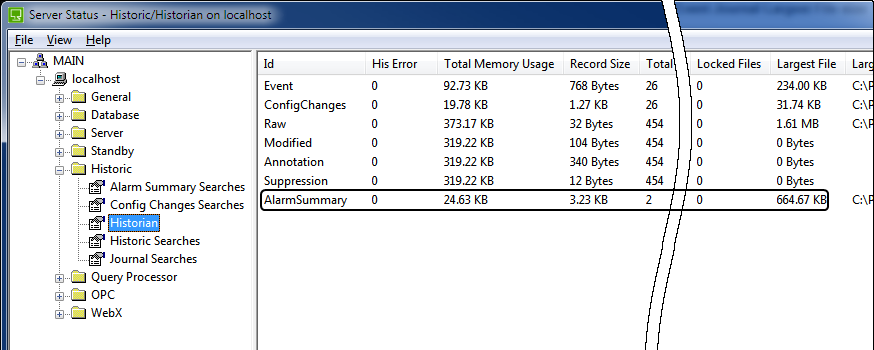 4. Look at the number of Total Primary File and Total Secondary File for the Event, Alarm Summary or ConfigChanges row.