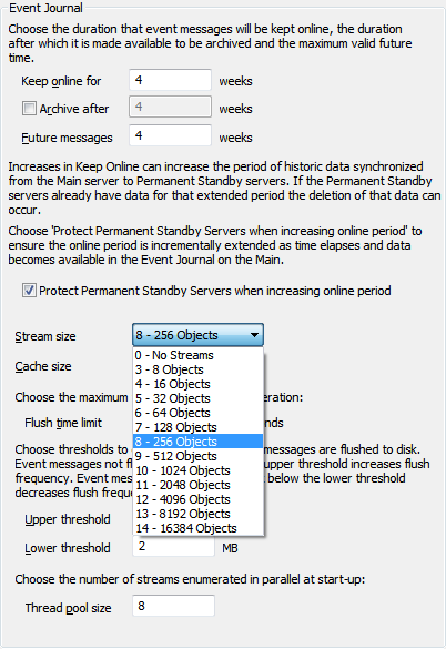 The Stream Size setting allows you to control the amount of data that is included in each event data file. By default, Geo SCADA Expert uses a Stream Size of 256 Objects, which means that each data file will contain an hour’s worth of data for a maximum of 256 database items. If the database contains more than 256 items, it will create extra files for the other database items (with each file containing the event data for a maximum of 256 items). For many systems, the Stream Size setting of 256 Objects is suitable.