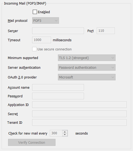 • OAuth 2.0 authorization—Select this option if the mail server uses OAuth 2.0 authorization for incoming mail. Specify the required authorization criteria in the OAuth 2.0 Provider, Account Name, Application ID and Secret fields (see below). Also specify the Tenant ID if that field is enabled for use.