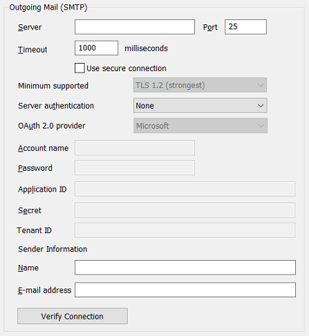 • OAuth 2.0 authorization—Select this option if the mail server uses OAuth 2.0 authorization for outgoing mail. Specify the required authorization criteria in the OAuth 2.0 Provider, Account Name, Application ID and Secret fields (see below). Also specify the Tenant ID if that field is enabled for use.