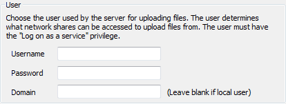 1. In the Username field, enter the user name for the Microsoft Windows user account that will be used to provide network access for uploading files.