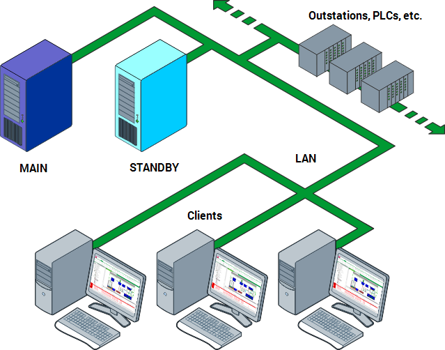 ATTENTION: If an offline Main-Standby connection is recovered, and the server that was originally Main is restored as the Main server, the data reported while the Standby server was Main may be lost. For example, if Server A has been Main for 10 hours when the connection is lost, Server B switches to Main. The connection to Server A is restored within 2 hours, and as Server A has been Main for longer than Server B (in total), it is set to Main and Server B is switched to Standby. The data that was reported to Server B while it was Main may be lost. If Duty-Duty support is enabled, the data will be merged (see Enable or Disable Duty Mode), otherwise the data is only retrievable if the outstations or PLCs being used support Windback. For more information, refer to the documentation for your outstations, PLCs etc.