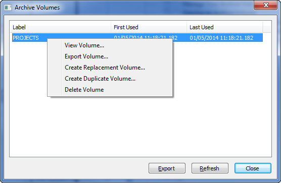 - Create Duplicate Volume—Use to create another copy of a volume. This is useful when you want to create backup copies for safe keeping. For more information, see Creating a Duplicate Archive Volume.
