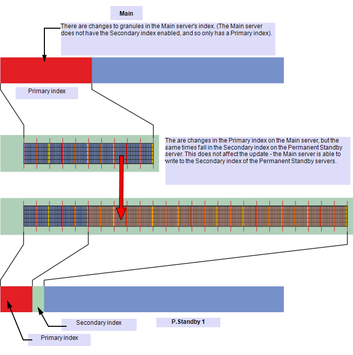When the Secondary index is enabled in a Hot Standby / Main server, granules that fall within the Secondary index have certain restrictions: