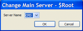 The Change Main Server dialog box is displayed. When you select the Change Main Server action from the Main server icon, the Change Main Server dialog box has a Server Name combo box.