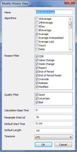 - Use the Modify Historic View window to alter the settings. The various fields and combo boxes work in the same way as the corresponding settings on the Add Historic View window.