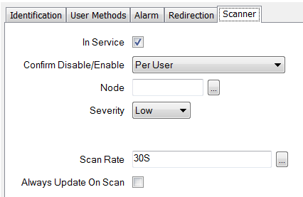 - Use the Confirm Disable/Enable field to specify whether a confirmation dialog box is displayed whenever a user requests that the scanner is disabled (taken Out of Service) or enabled (placed In Service).