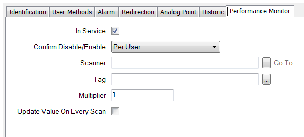 For further information about configuring Performance Monitor scanners and analog points, see the Geo SCADA Expert Guide to the Performance Monitor Driver.