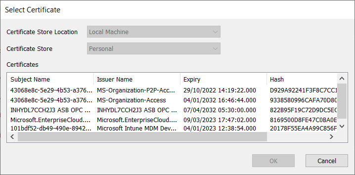 - Server Certificate—OPC UA clients use the server certificate to confirm the server's identity. Use the Choose button next to the Server Certificate field to display a Select Certificate window. Use the window to view the details of the current certificate that is in use or to select a new certificate from the list of available certificates that Geo SCADA Expert is to use.