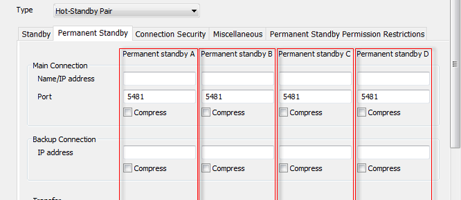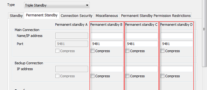 Use the Permanent Standby tab to configure the settings for the connection between the Main or Standby server on which you are working and the Permanent Standby servers in the architecture.