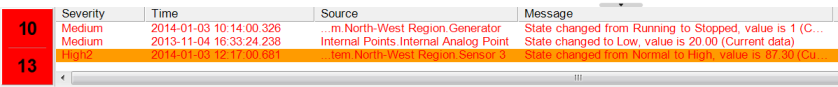 The user selects a different alarm. The background color of the alarm the user selected originally changes from blue to orange. This is because the alarm is no longer selected and so the Alarm Can Acknowledge color does not apply. As the alarm has not been acknowledged, the alarm’s background is orange - the color defined for the Alarm Can Acknowledge setting.
