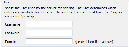 1. Use Microsoft Windows to create a basic user account on the server with that account's access restricted to using suitable printers that are available on the server. In addition the user needs be assigned the 'Log on as a Service' security privilege. Refer to your Windows Server administrator for details of how to configure a restricted user account and assign security privileges.
