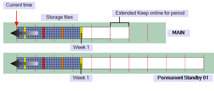 Geo SCADA Expert allows you to increase the Keep online for setting to extend the period of historic data synchronized from the Main server to Permanent Standby servers. The Protect Permanent Standby Servers when increasing online period feature allows you to ensure that the existing data on Permanent Standby servers is not deleted when you extend the period. By default Permanent Standby servers are protected when you increase the Keep online for period on the Main.